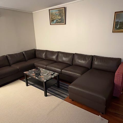 Kjøper må hente og bære ut sofa på egenhånd.