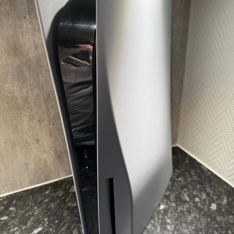 Sony Playstation 5 spillkonsoll med to trådløse kontrollere i hvit og blå farge. Støtter 4k / 120hz.