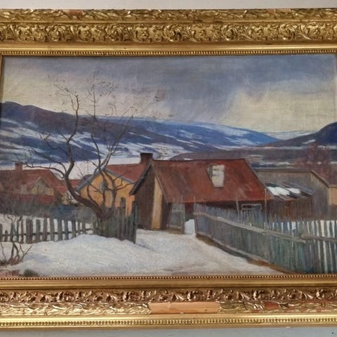 En liten skade på rammen på den ene kanten. Synes ikke når bildet henger på veggen.