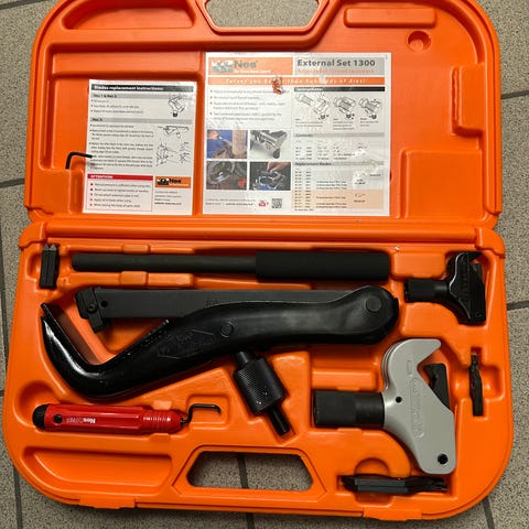 Verktøysett med ulike gjengeverktøy og tilbehør i et gult plastetui. Settet inneholder flere gjengehull, gjengeverktøy og håndtak for ulike gjengeoperasjoner. Egnet for mekanisk arbeid og reparasjoner som krever gjenging.