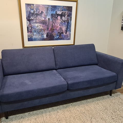 Sofa kjøpt fra møbelringen for en del år siden. Veldig behaglig å sitte i og tar relativ liten plass. Også mulig å ta den fra hverandre for frakting. Kommer med fot skammel. Har noe synelige falming/solfalming av fargen på putene.