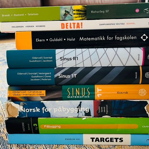 Bøkene er såvidt brukt, men alle sammen har noen transport skader. Derfor er noen av kantene på bøkene synlig brukt. Fagbøkene er: Pareto 2 (samfunnsøkonomi 2), Delta (Samfunnskunnskap) og Matematikk R2. Pareto 2 selger jeg for 250kr, Delta: 250kr og R2: 300kr