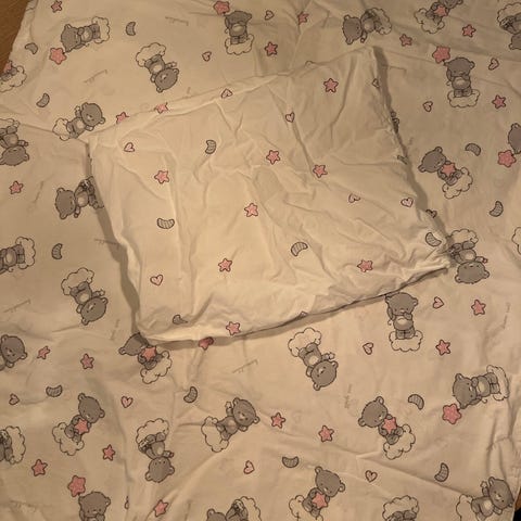 Rosa sengetøy med hvite prikker og bilde av en bjørn. 100 % bomull. Passer til pute 35x40 og dyne 80x100.