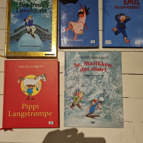 Astrid Lindgren barnebøker samling med titler som Pippi Langstrømpe, Emil, Per Pusling, og flere. Bøkene er på norsk og passer for barn. Astrid Lindgren barnebøker. Bøkene er illustrert og passer for barn og unge lesere.