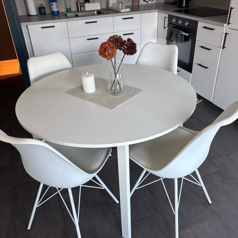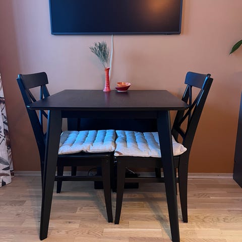 Selger et moderne og praktisk spisebordsett fra IKEA, bestående av 4 stoler og 1 bord. Settet er lite brukt og under ett år gammelt. Perfekt for både små og middels store hjem – tar lite plass, og har god sittekomfort.