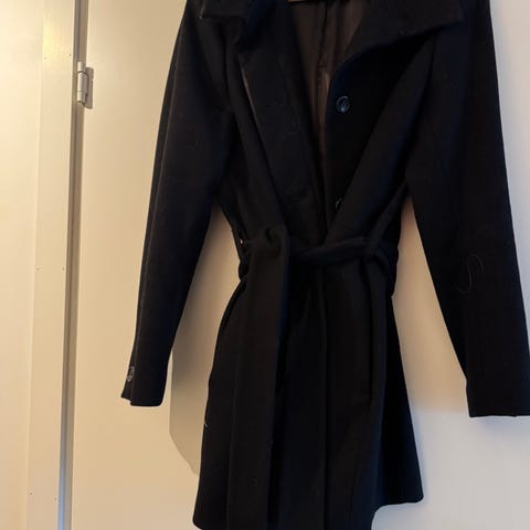 Pent brukt kåpe i ull og kashmir. Kamelhårfarget. A-fasong. Skjerf/sjal som kan tas av.