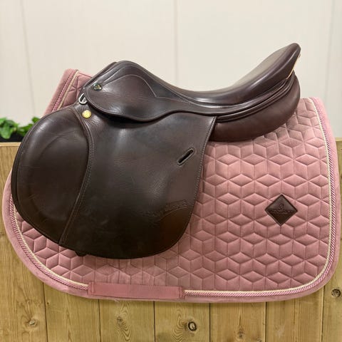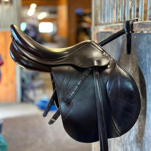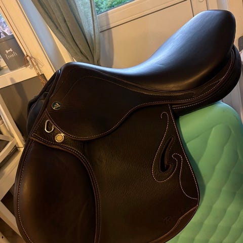 Brun, 17’’ i setet, 34’’ i bomvidde. Oppbevart i oppvarmet salrom og jevnlig pusset. Ble kjøpt fra Salteamet sommeren 2025, men rytter har vokst ifra den. Fantastisk god å sitte i, kan endres både i bomvidde og i stoppingen.