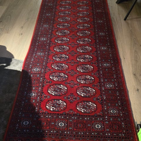 Tykk og god å gå på. Selges fordi den er litt for lang i gangen der jeg bor nå. Den er kjøpt brukt av teppesamler så jeg vet ikke hvilket land den kommer fra. Det er et praktverk av en løper.