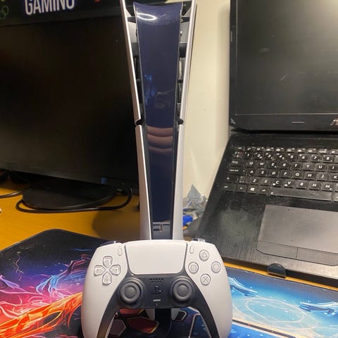 Playstation 5 spillkonsoll med hvit kontroller. Konsollen har et moderne design med hvite paneler og svart midtseksjon. Kontrolleren er trådløs og har ergonomisk utforming for spillopplevelse.