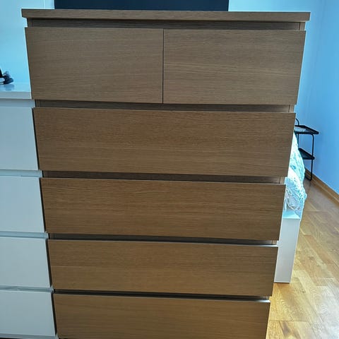 Selger en stilren og romslig IKEA MALM kommode med 6 skuffer i hvitbeiset eikefiner. Kommoden har et tidløst design som passer godt inn i både soverom, gang eller stue. God oppbevaringsplass og skuffer som glir lett.
