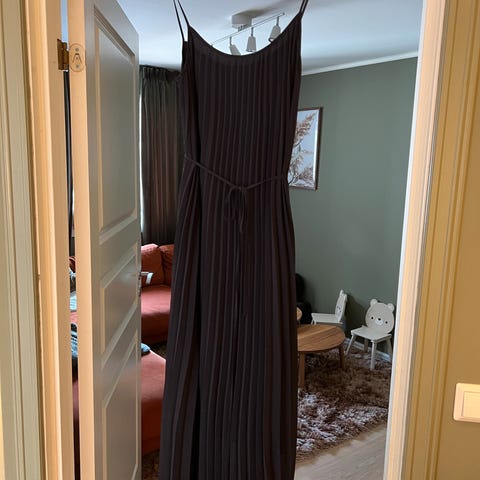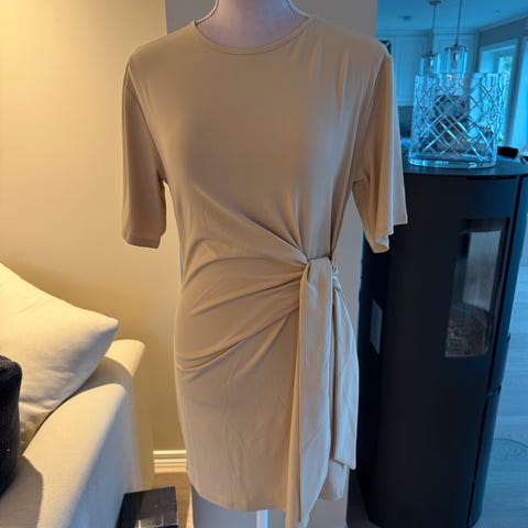 H&M hverdagskjole i beige farge, størrelse XS. Laget av bomullsmateriale. Kort, tettsittende, ermeløs kjole i ribbet bomullsjersey. Har en vid halsutringning med V-åpning foran. Bomull 97%, Elastan 3%