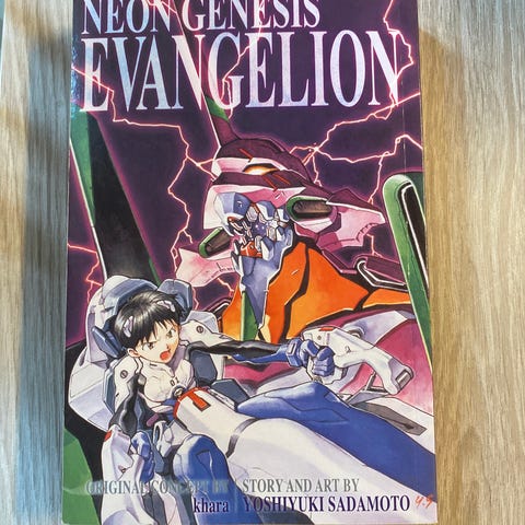 Liten bok med motiv fra Evangelion-serien, viser to karakterer i fargerike drakter. Passer for samlere og fans av anime.