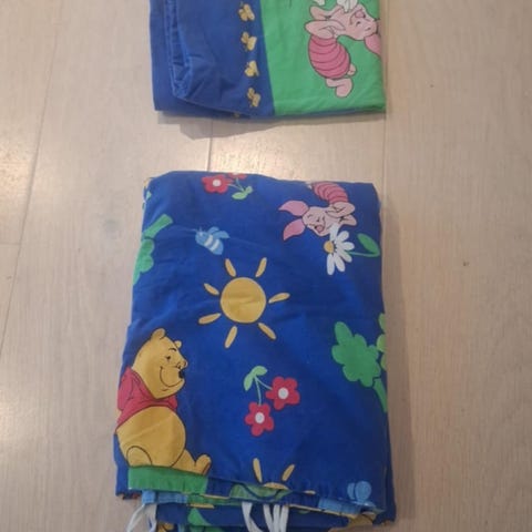 Sengetøy i bomull med Ole Brumm og vennene hans. Lukkes med trykknapp (en mangler). Passer pute 35x40 og dyne 80x100 cm.