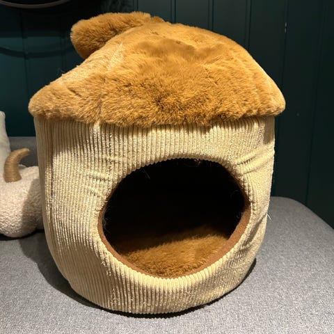 Klatrestativ for katt med flere huler og beige farge. Laget av tekstilmateriale egnet for katter å klatre og hvile i. Høyde ca 120cm og diameter 45cm.