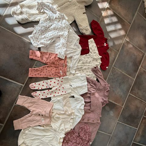 5 bodyer, tre kjoler, en cardigan, fire bukser, tre pysjamaser og en cardigan