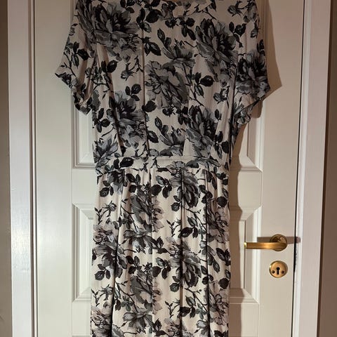Nydelig lang, mørkeblå kjole med orange/gyllen blomstermønster.