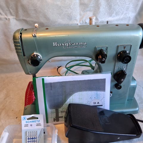 Husqvarna Viking symaskin i grønn farge. En solid og god symaskin. Maskinen leveres med tilbehør som fotpedal "koffert", spoler, trykkføtter og div(se bilde)Egnet for ulike syprosjekter og reparasjoner.