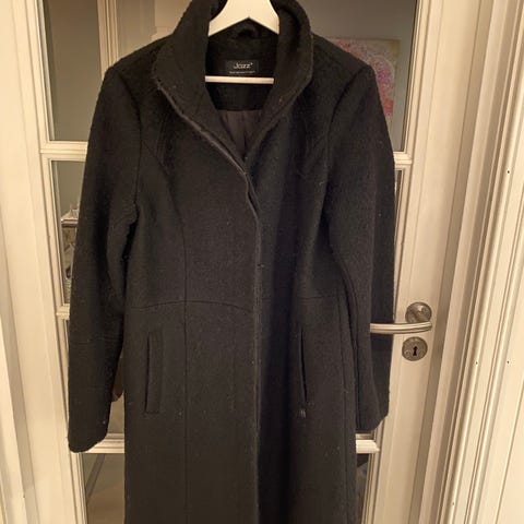 Selges en klassisk svart ullkåpe fra Jazz med tidløst design. Kåpen har krage, skjulte knapper foran og to lommer på sider.