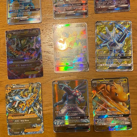 Samling av Pokémon samlekort med forskjellige figurer og egenskaper. Kortene inkluderer blant annet Dialga EX og Giratina EX, samt flere andre Pokémon-kort med varierende angrep og forsvar. Egnet for samlere og spillere av Pokémon kortspill.