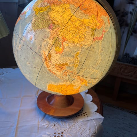 Nydelig vintage globus med trefot og lys.