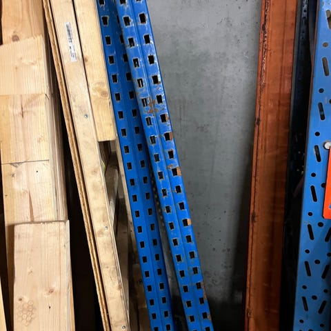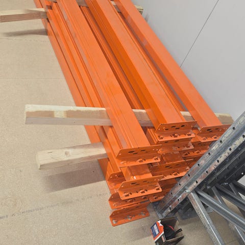Pallereol laget av stål med grå og oransje farger. Egnet for lagring og organisering av varer i lager eller industrielt miljø.