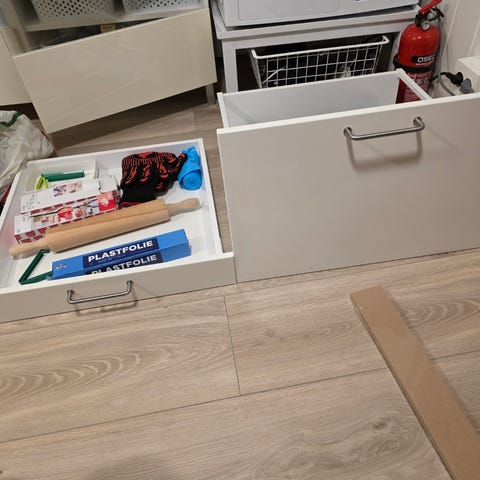 2 stk vardø sengeskuffer fra Ikea selges. 1 har slitasje ved knapp, se bilde, men knappen fungerer fint. 1 har montert bunnen feil vei, se bilde. Både knapper og trekk fungerer. Hentes ved Strandveien i Tromsø. Selges for 150 per stk, selges helst samlet for 300 kroner.