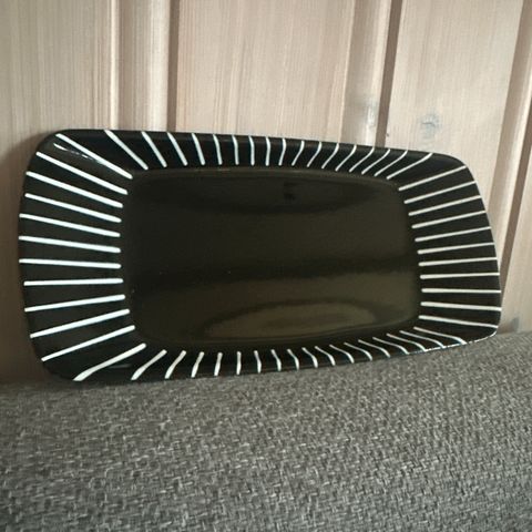 Emaljert rustfritt stål, med en svart farge og hvite kanter.