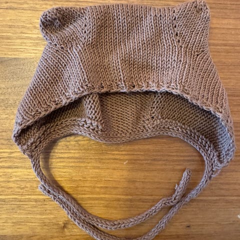 Hjemmestrikket okergul lue med dusker. Duskene kan tas av for vask.