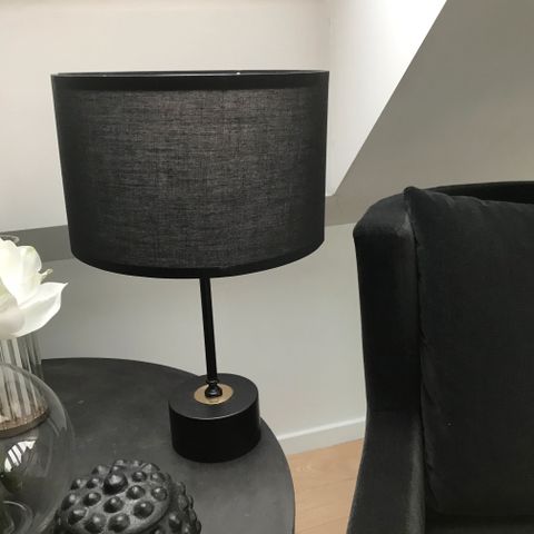 Bordlampe med hvit skjerm. Høyde: 31 cm. Lampeskjerm diameter: 19 cm. Fot i børstet stål.