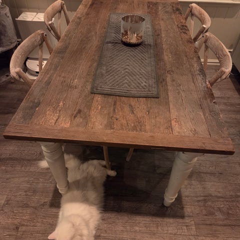 Bordet er 90 x 200 cm (ileggsplate 40 cm). Bordet har noen hakk og bruksmerker.