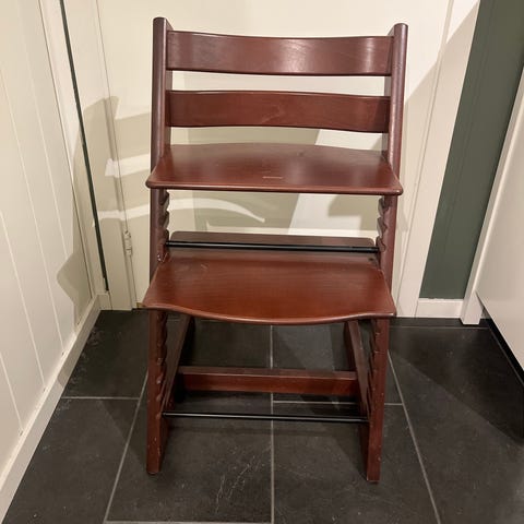 Stokke tripp trapp barnestol i tre. Pute føger med. Har ikke bøyle. Stolen står på Saupstad.