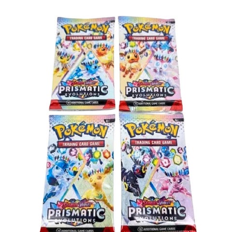 Sealed artset av Prismatic Evolutions. Her er alle de 4 mulige artworkene som finnes i settet. Følger med sleeve til alle pakkene.