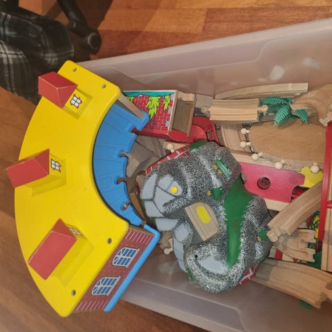 BRIO Togsett barn leker med ulike tog, kjøretøy, skinner, broer og tilbehør. Settet inneholder flere togmodeller, kran og andre konstruksjonselementer i tre og plast. Passer for barn som ønsker å bygge og leke med togbaner.