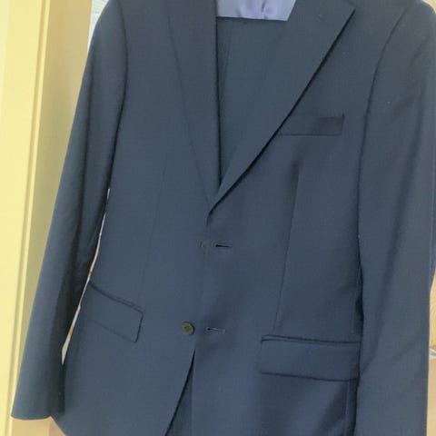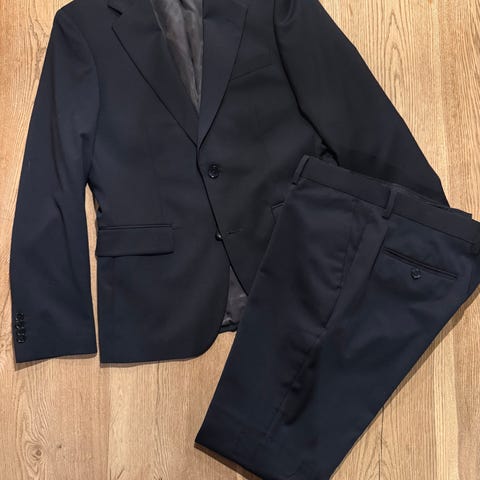 Mørk blå dress med jakke i str.46 og bukse i str.31/32 slim fit. Veldig lite og svært pent brukt.