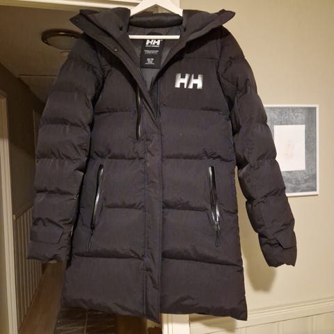 Veldig varm jakke i god damestørrelse, vil si den tilsvarer 48/50. Kjøpt og brukt to ganger, men den ble altfor stor. Marineblå med hvitt print på bryst og øverst på rygg. Stor herlig hette, som kan holde snøfokk og nordavind utestengt. Kjøpt på salg til 2400,- selges 1500,- Dette er veldig billig! Jeg har kjøpt meg ny i mindre størrelse 😉