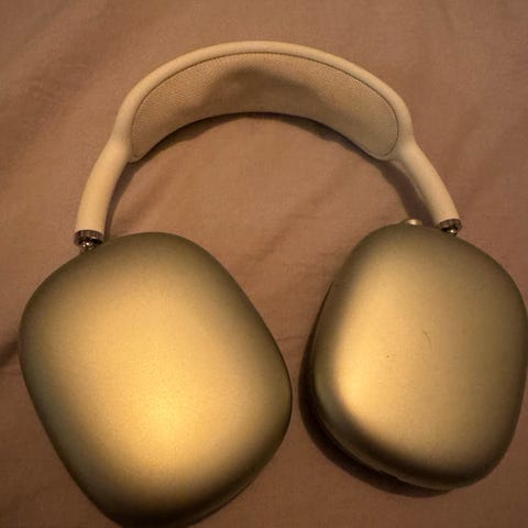 Nesten ubrukt Apple AirPods Max hodetelefoner i grå farge. Over-ear design med polstrede øreputer for komfort. Trådløs tilkobling med aktiv støydemping. Leveres med et deksel for oppbevaring.