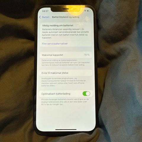 Blå iPhone 12 med 128 GB lagringskapasitet. Noen riper i lakken langs sidene, men har hatt skjermbeskytter alltid, så skjerm/glass er helt intakt. 80% maksimal batteri kapasitet. Knapper og ladeport fungerer som normalt.