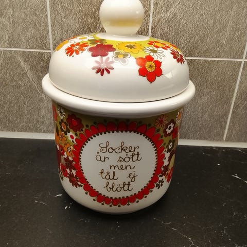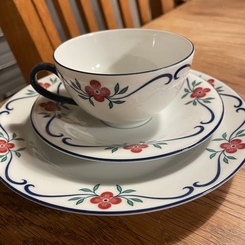 Rörstrand servise med kopper og sukkerskål, dekorert med motiv av barn i tradisjonelle klær. Produktet er laget av porselen og egnet for servering av drikke og sukker.