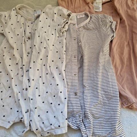 H&M flerfarget babyklær sett i bomull, størrelse 74, unisex. Sett bestående av flere plagg med ulike mønstre og farger, egnet for barn.