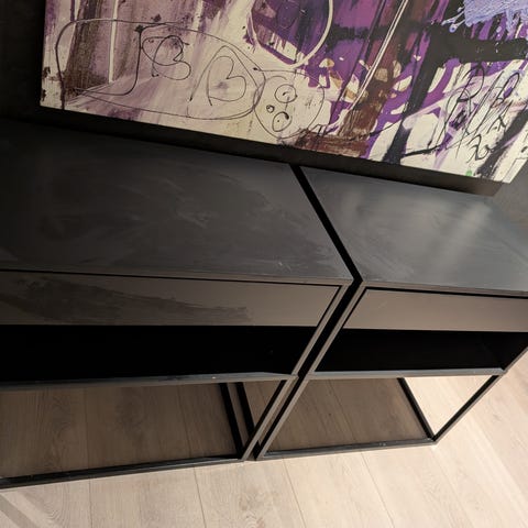 To nattbord med hyller inni. God stand, liten skade på det ene. Ellers gode og solide nattbord.