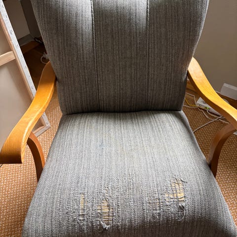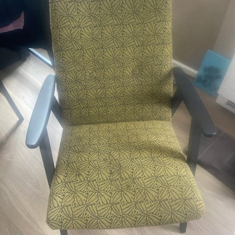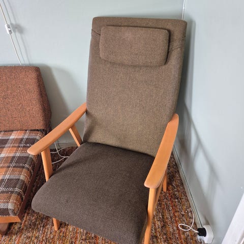 Lenestol fra ca 1975. Godt tatt vare på. Alltid brukt teppe på den. Ser ingen skader. God å sitte i. Må hentes. Har også en stol med rødt trekk om noen ønsker 2 stoler. Pris pr stk.