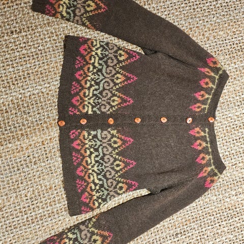 Selger en solid, håndstrikket ullgenser i dame str. S. Strikket i tykk, ekte ull med svært god passform og høy kvalitet. Klassisk norsk mønster med dekorative detaljer og metallhekter i åpen hals.