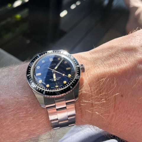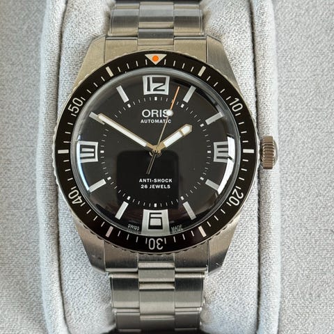 Selger en meget pen Oris Divers 65, ref. 01 733 7707 4055. Kjøpt ny i Norge 2023. Leveres med original stål-lenke pluss ikke-original gummireim (kjøpt hos urmaker).