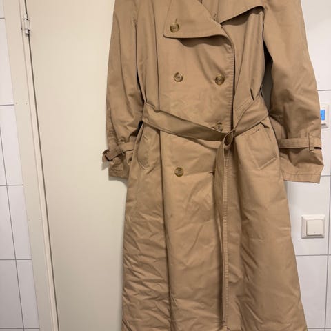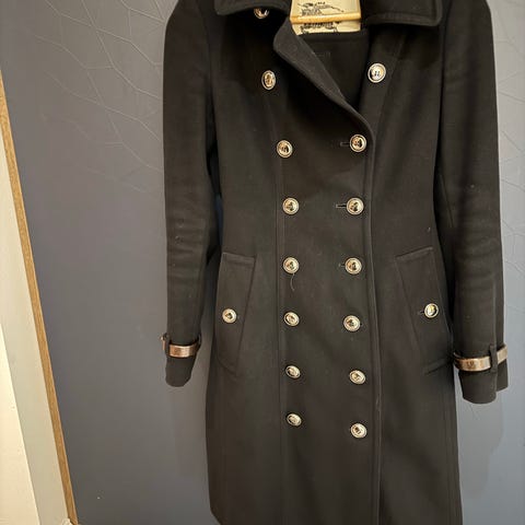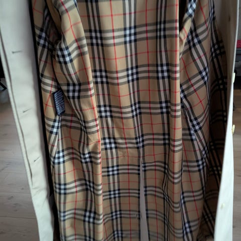 Burberry poncho fra tidlig 80-tall laget av ullmateriale. Plagget har en blå farge med Burberrys klassiske rutemønster, her i mørkeblå, hvit og rød. Tykk ull og har litt tyngde. Svært pen tilstand. One size. Mål per side når lagt ut 110cm. Krage er nokså stiv og elegant. Innside er blå over hele.