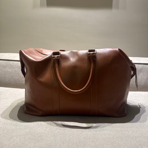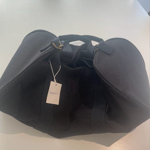GANT weekendbag i beige farge med svarte striper. Bagen har to bærehåndtak og en avtakbar skulderrem. Den har glidelåslukking og flere lommer for oppbevaring.