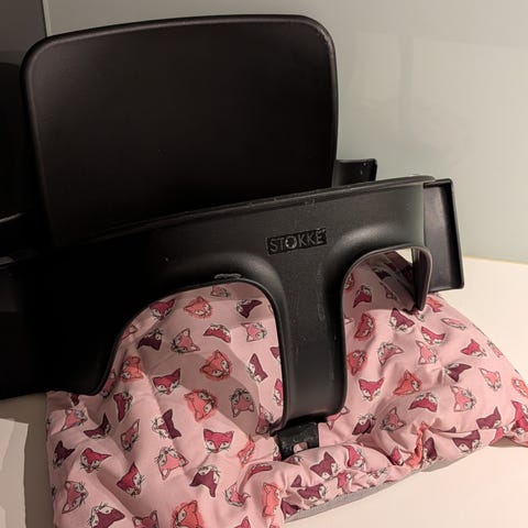Selger et Stokke Newborn Set som gjør at babyen kan sitte med ved bordet fra fødselen av.