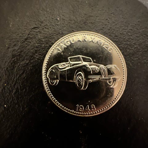 Stilige glassunderlag med veteran volvo. Den ene har løsnet litt fra plata.