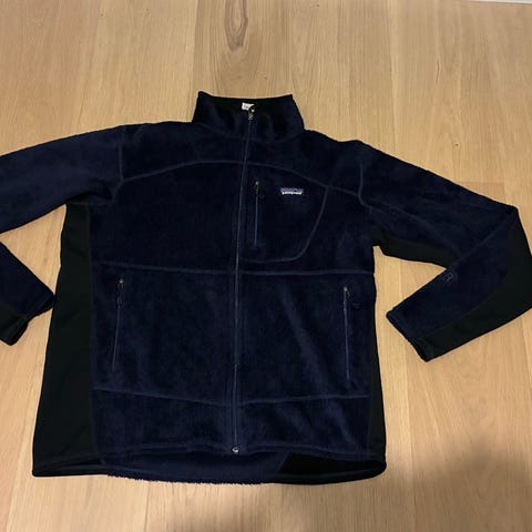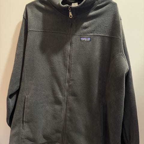 Patagonia Jakke i mørke blå fleece, herrestørrelse L. Jakken er laget av fleece materiale og er egnet for utendørs bruk.