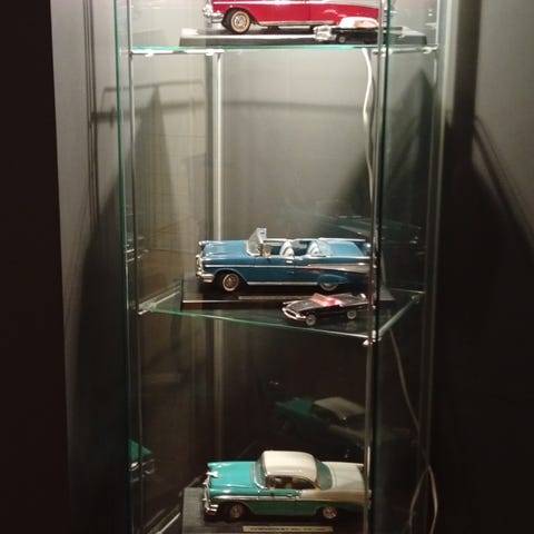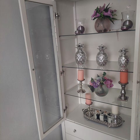 Pent vitrineskap fra IKEA, pent brukt og i god stand. Et par bruksmerker. Det er montert lys der det er glass i dørene, det mangler trafo.