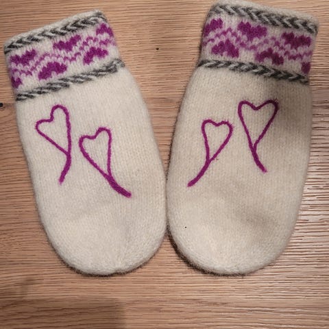 Tovede votter strikket av Rauma vams garn. Nålefiltet pynt. Hentes i Moelv eller sendes med fiks ferdig.